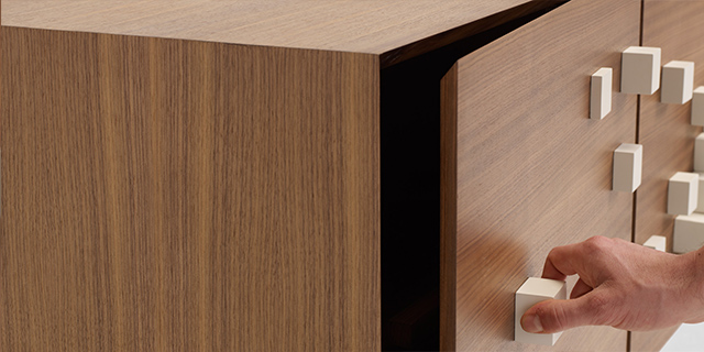 Buffet Square Dimensions Lenght 2m40 Width 55cm Height 70cm Materials American walnut Legs in oak White lacquered cube